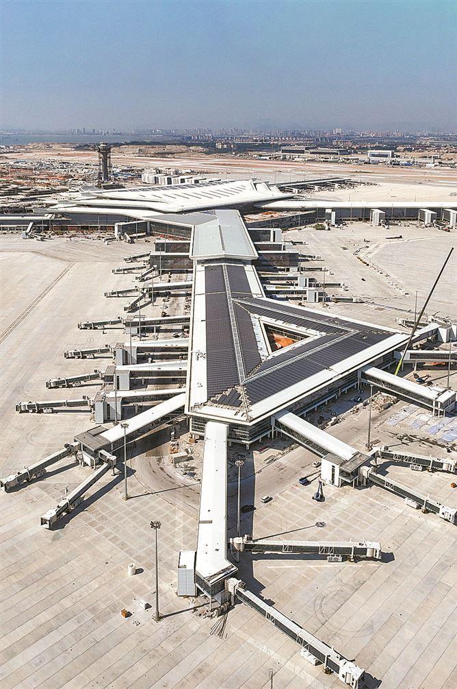 全景图中,55万平方米的航站楼以“大厝”三重檐叠落造型惊艳亮相,“出砖入石燕尾脊”等闽南元素与11.8万平方米金属屋盖相映成趣,北一、南一双跑道如双翼舒展,3800米长的4F级北一跑道可起降全球最大客机,各个通航必备项目一览无余,尽显宏大气势。