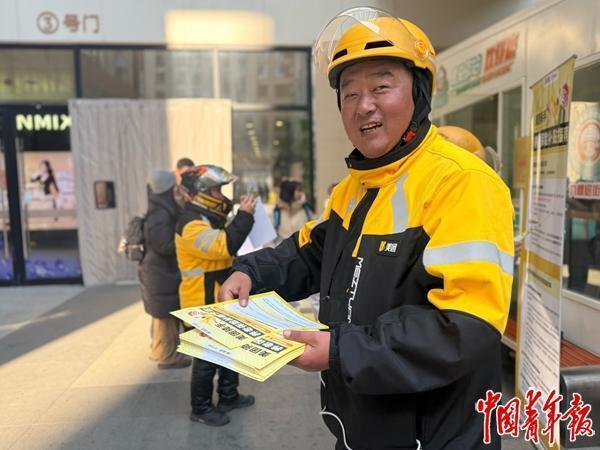 12月11日,北京市通州区,一名骑手在分发平台的社保补贴宣传单。