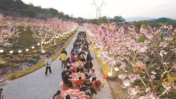 以前,“风铃谷”仅是一座涉足凤梨采摘的家庭农场,后来栽上了紫花风铃木,开设了露营区……1月份,紫花风铃木迎来盛花期时,风铃谷正式转型。“与其说是经营农场,不如说是经营景区。”周夏怡表示,面对迅速增长的客流,农场招聘近20名兼职人员接待游客,甚至增设广播应对儿童迷路等特殊情况。