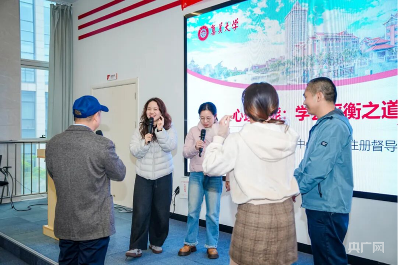 活动现场,厦门大学马克思主义学院教授、博士生导师张艳涛深入浅出地解读了“十五五”国家规划建议,并结合未来职业机遇与青年个人发展,给大家带来一场深刻而前瞻的分享;集美大学心理咨询中心主任、心理学博士林赞歌则带领参会者开启了一场别开生面的心理探索,通过保健操、情绪绘画、情景剧表演等互动方式,青年们在轻松氛围中表达压力、分享烦恼。